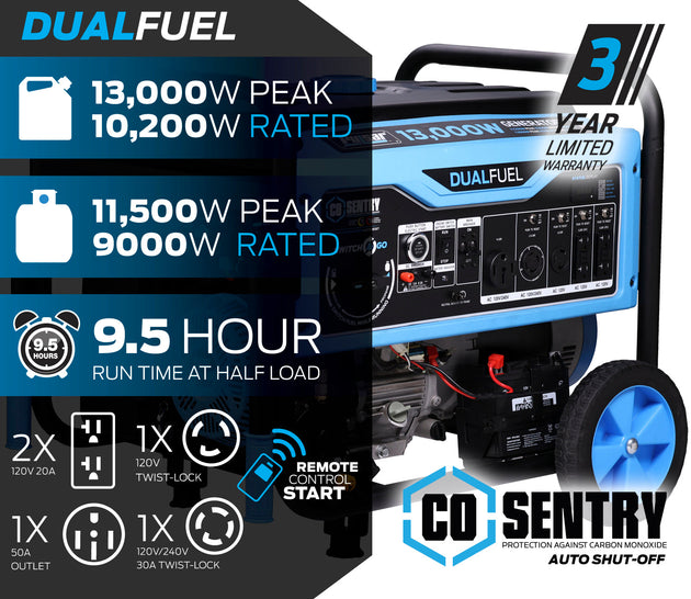 Pulsar 13,000 Watt Dual-Fuel Portable Generator with CO Sentry