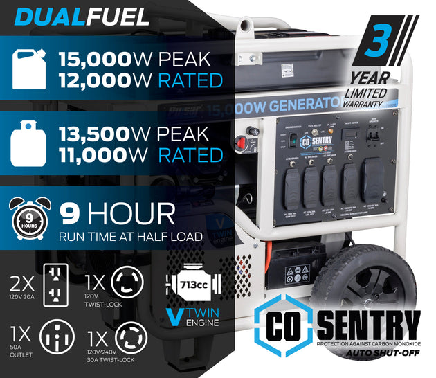 Pulsar 15,000 Watt Dual-Fuel Portable Generator with CO Sentry