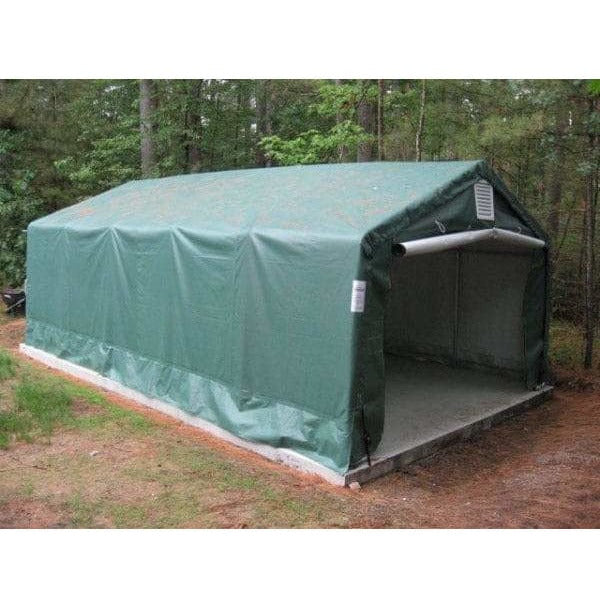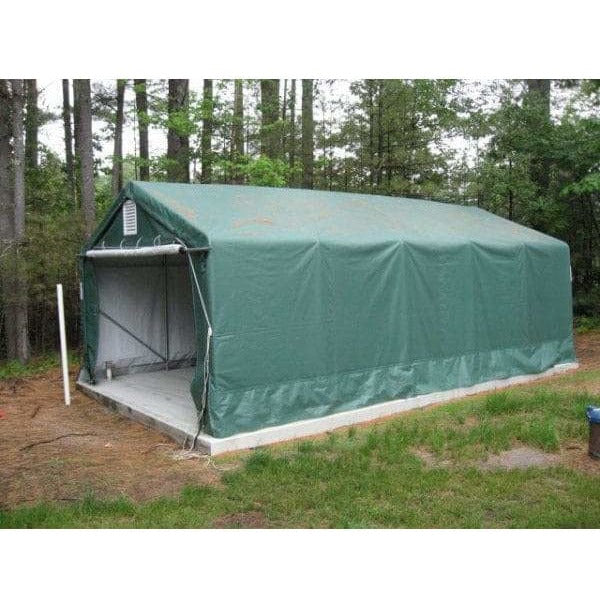 The pre-drilled frames allow for simple assembly with minimal hand tools. The main cover and doors are composed of long-lasting UV-resistant and fire retardant poly with fabric backing and heat-welded seams. This shelter is available in forest green, gray, and tan colors.